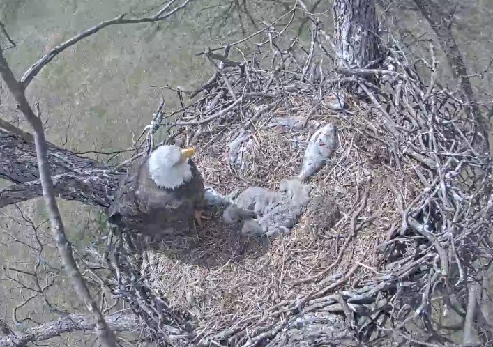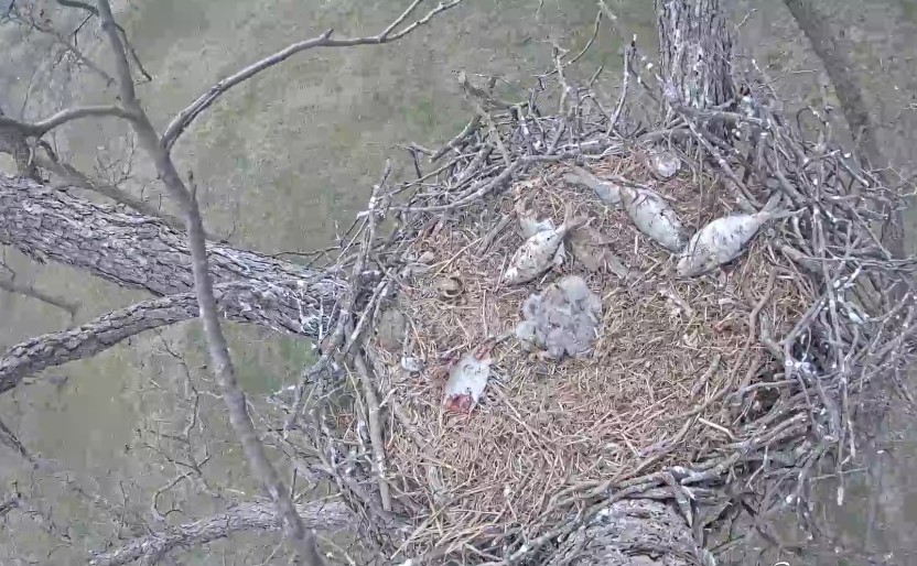 7 April 2022: All three chicks are in a huddle, surrounded by a smorgasbord of fish and turtles that have been provided to the nest today! Good hunting!