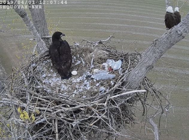 27 March 2019: A subadult eagle landed on the nest and began eating leftover food. Before long, one of the adults flew in to aggressively displace the intruder!