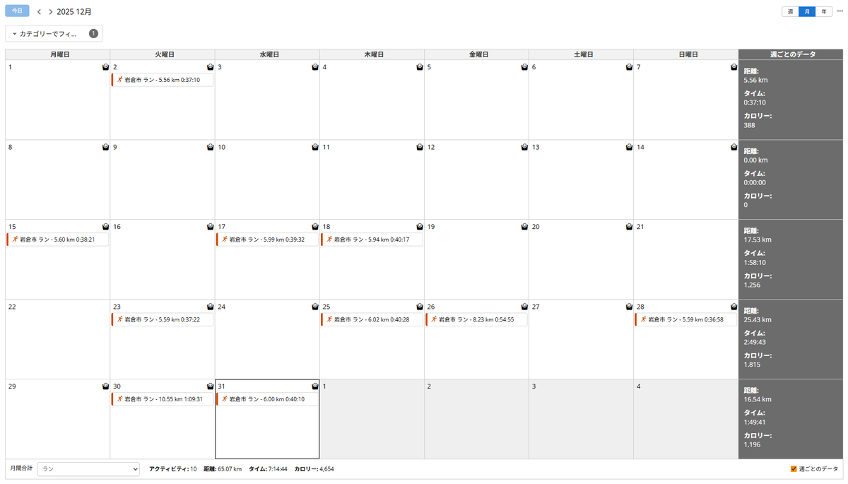 12月のランニングは10回、月間走行距離は 65.07 km。