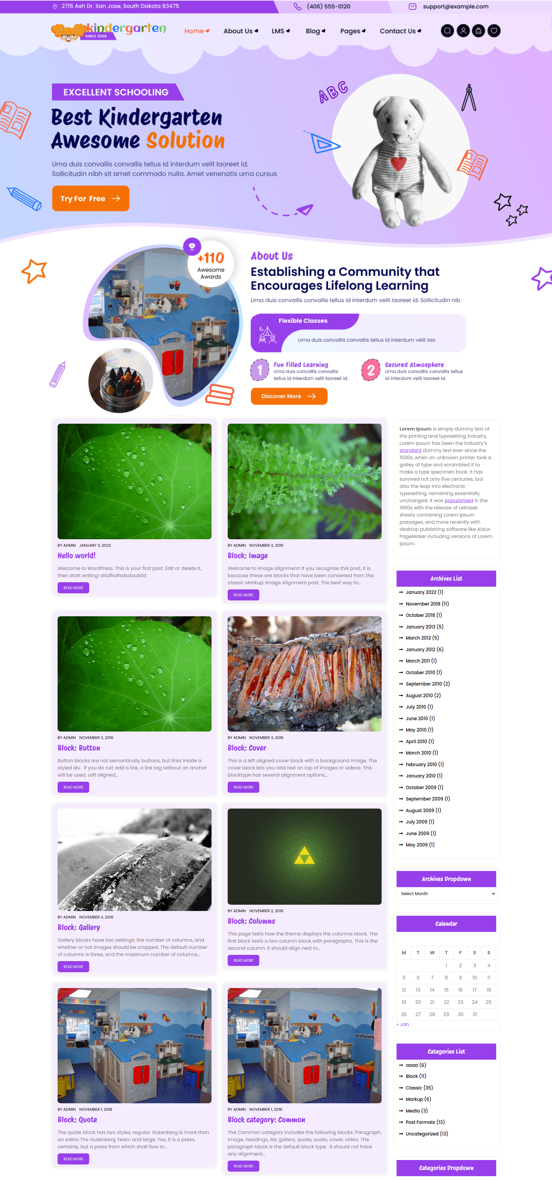 The Free Kindergarten WordPress Theme offers a responsive design, ensuring that the website looks great and functions smoothly on various devices, including tablets and smartphones. The theme includes customizable sections for displaying important information such as the kindergarten's mission, programs, and teaching staff, which helps build trust and transparency with parents. Integration with social media platforms allows for seamless sharing of updates, news, and events, keeping the community connected and informed. It also includes easy-to-use contact forms that enable parents to inquire about enrollment and communicate with staff directly through the website. The Free Kindergarten WordPress Theme also emphasizes accessibility, with features like language support and translation-ready capabilities, ensuring that families from diverse backgrounds can access and benefit from the information provided. With its comprehensive set of features, user-friendly design, and emphasis on early childhood education, this theme is an excellent resource for kindergartens and early learning centres looking to establish a professional and welcoming online presence.