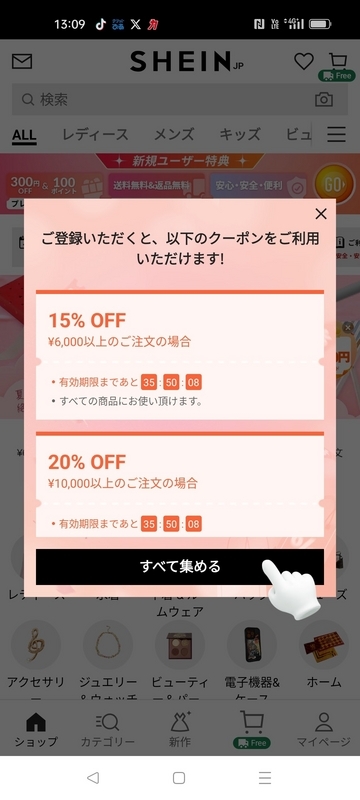下記はSHEINという世界最大のアパレル通販のアプリです。アプリをダウンロードして新規で開くとはじめにこのような画面が出ました。