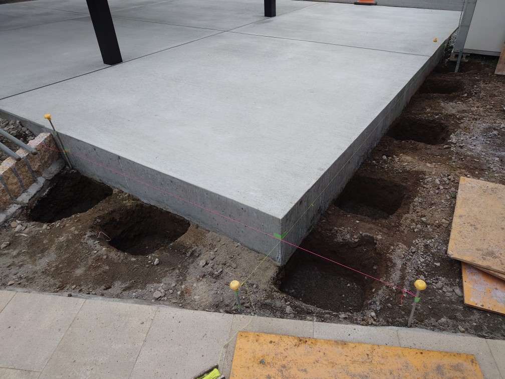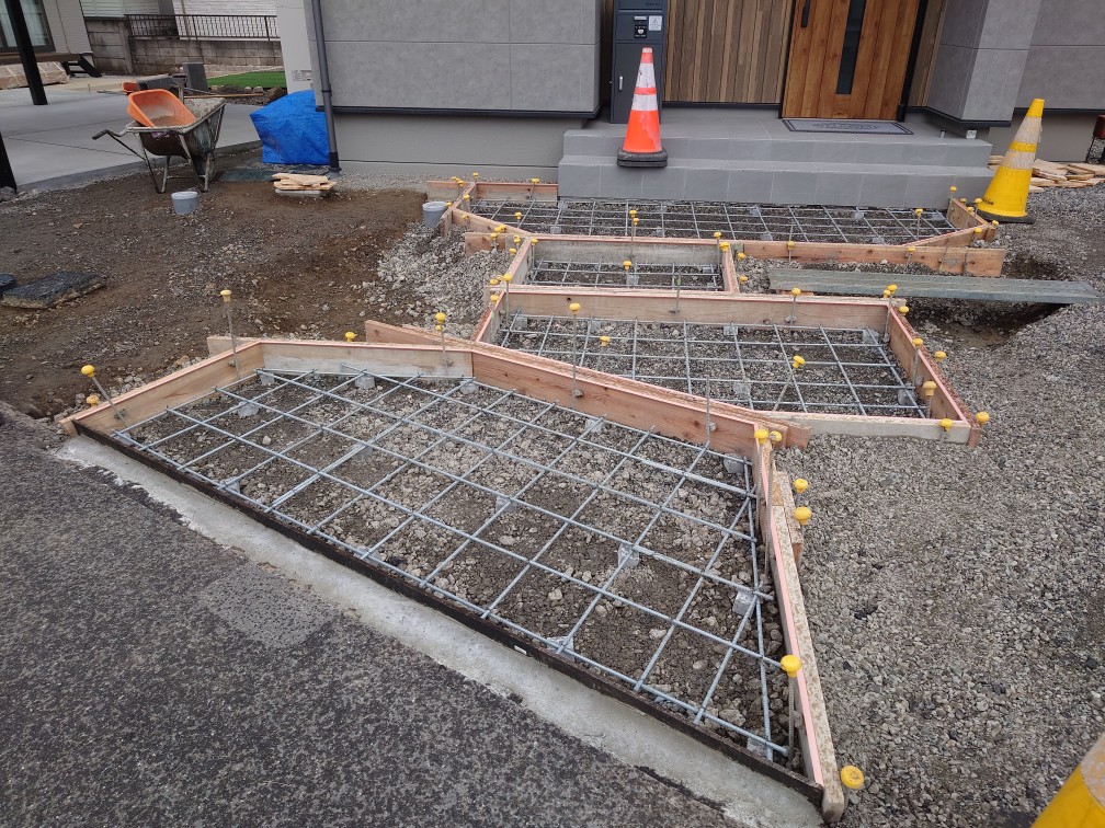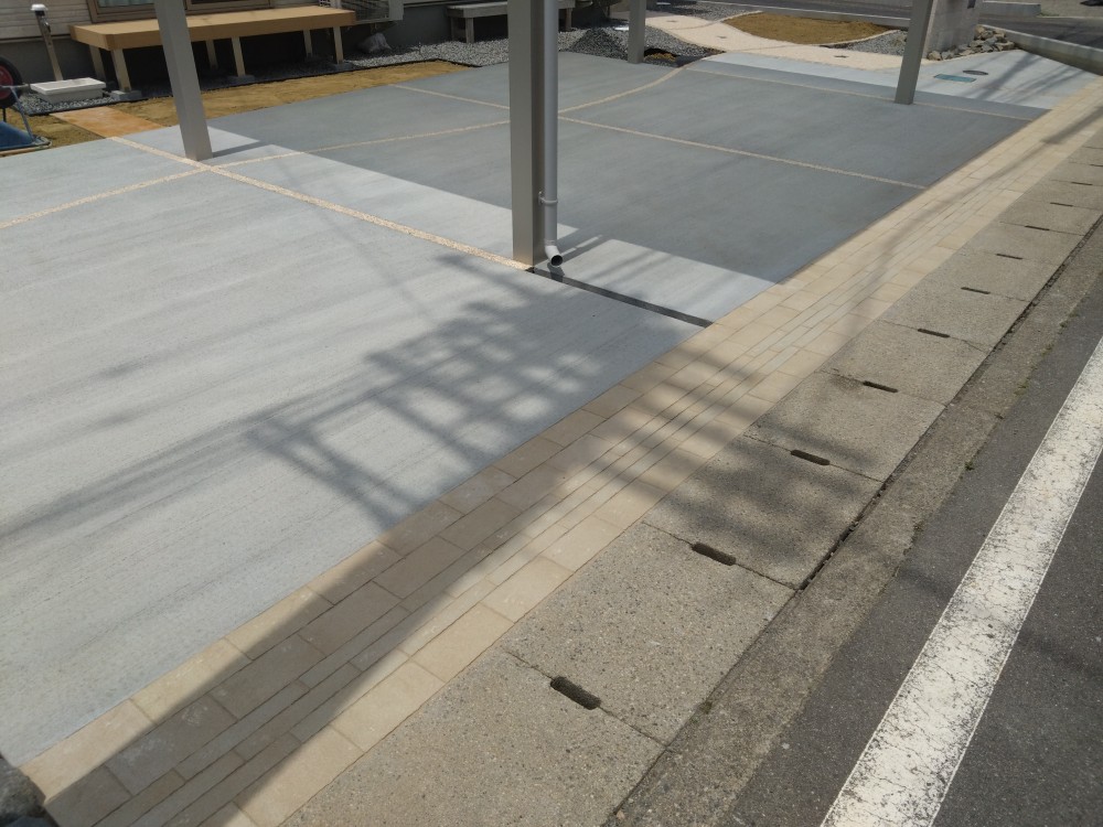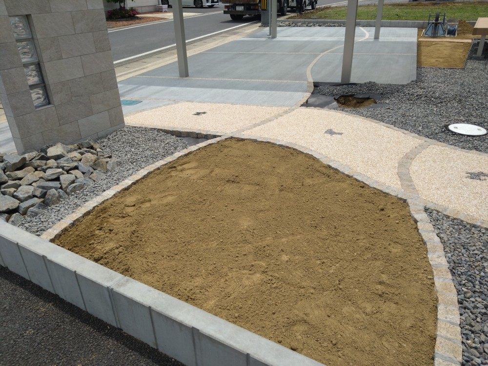 先日据え付けたプラーガブリックにジョイサンドハード(固まる珪砂)を入れて道路際を仕上げて車の乗り入れが出来るようになりました。土間スリットのファイバーレジンとアプローチのリンクストーンも硬化が確認が出来たのでバリケードを開放しました。リンクストーン内に埋め込んだ犬をかたどったワンポイントも綺麗に仕上がり、お客様にも喜んでいただきました。残工事に植栽が残っているのでもう少しで完了になります。冬場から着工させていただき春先までコンクリート打設をお待ちいただいてようやく竣工になります。お客様にも車両の移動等ご協力いただきありがとうございました。