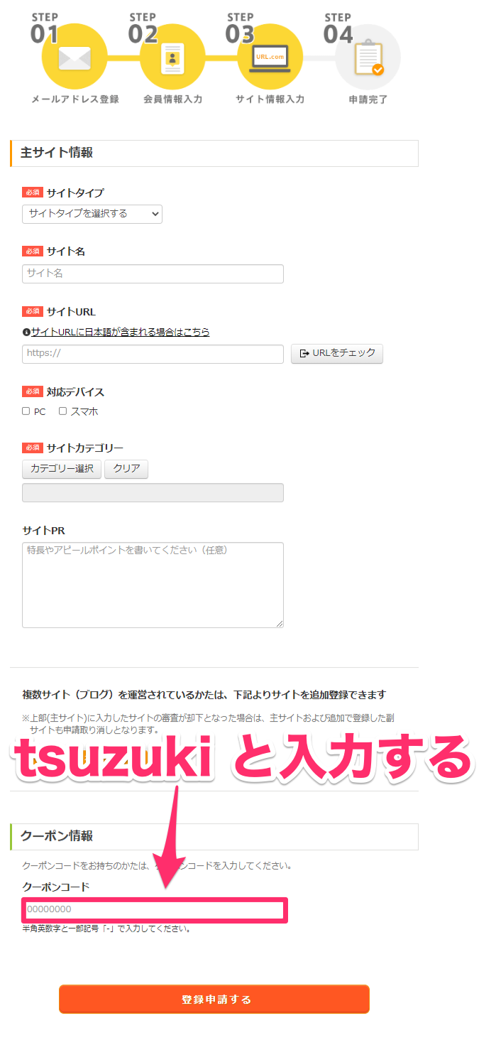 下記のように、アクセストレード申込画面の「STEP03 サイト情報入力」にて、クーポンコードを入力してみてください。