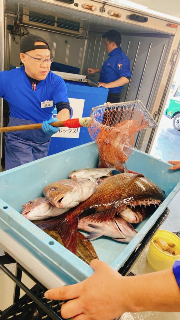 毎日片名漁港・豊浜漁港でセリに参加して、水揚げされたばかりのぴちぴちの活黒鯛を競り落とします