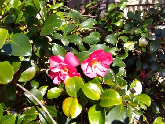 神社だか公園だかの外垣に、咲き残りのツバキがあった。
