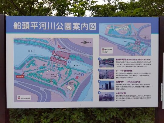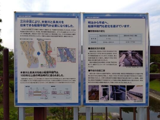 上の写真から少し視線を左にずらしたところに「船頭平河川公園案内図」と「船頭平閘門について」という2枚の説明書きがあった。