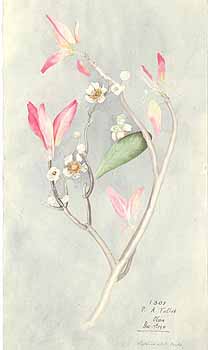 花は大きな頂生の頭状花が樹冠全体に見られ、芳香があり、それぞれ幅2.5センチメートル、5つの不揃いな花弁と5つの萼片を持ち、中央には数多くの黄色い雄蕊(雄しべ)が見られる[8]。円錐花序である[5]。