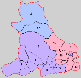 - 明治4年(1871年)から明治8年(1875年)にかけて下記の町村の統合が行われる。カッコ内は統合時期。(18村)