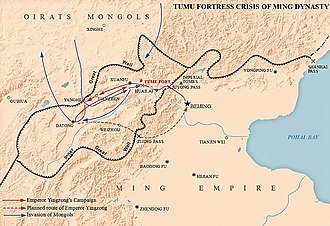 1449年(正統14年)7月、エセンは名目上の主君であるモンゴルのハーンのトクトア・ブハと協力し、陝晋遼の3方面より明領へ侵入した。中央軍を率いて山西に侵攻したエセンは、騎兵2万により大同へ進軍する。当時明の権力を掌握していた宦官の王振は正統帝に親征を要請。朝廷内の反対を押し切って王振を総司令官とし、50万と号する大軍が召集され、20人の武官と多くの文官とともに出撃した。