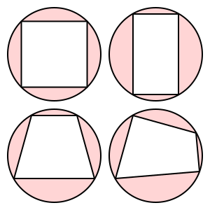 外接円を持つ多角形は、円内接多角形 (inscribed polygon), cyclic polygon (輪状多角形) あるいは、そのすべての頂点が同一円周上にある(つまり、共円である)ことにより共円多角形 (concyclic polygon)などと呼ばれる。任意の正単純多角形や任意の等脚台形、任意の三角形、任意の長方形は共円多角形の例となる。