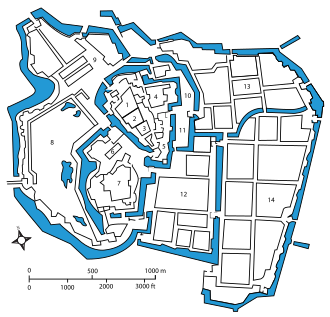 本丸・二ノ丸・三ノ丸に加え、西ノ丸・西ノ丸下・吹上・北ノ丸の周囲16kmにおよぶ区画を本城とし、現在の千代田区と港区・新宿区の境に一部が残る外堀と、駿河台を掘削して造った神田川とを総構えとする大城郭に発展した。その地積は本丸は10万5000余町歩、西ノ丸は8万1000町歩、吹上御苑は10万3000余町歩、内濠の周囲は40町、外濠の周囲は73町となり、城上に20基の櫓、5重の天守を設けた。