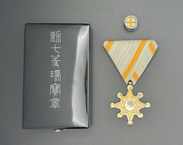 | The Order of the Sacred Treasure, Gold Rays with Neck Ribbon | The Order of the Sacred Treasure, Gold Rays with Rosette |