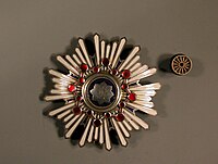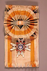 勲一等瑞宝章の正章と副章[1]。現行の瑞宝大綬章と本体部分の意匠は同じ。