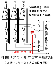 センタータップ接続整流は流通角が小さくトランス巻線の利用率が悪く大型化させるので、巻線をセンタータップ部で分離し相間リアクトルを挿入してその中央から直流を得ることでトランス各巻線の流通角を大きくして実効容量低下を抑えている。この接続を特に「相間リアクトル付2重星形結線」と呼んで三相交流を水銀整流器で整流する際の標準的結線となった。三相交流では6相式(6パルス式)となる。