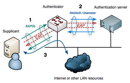 EAPメッセージを認証LANスイッチを経由して認証サーバと何度かやりとりを交わすことで、認証を受ける。サプリカントのMACフレームは認証LANスイッチによってRADIUSフレームに変換されて認証サーバへ送られ、逆に認証サーバから返信されるRADIUSフレームは認証LANスイッチによってMACフレームへ変換されてサプリカントへ送られる。認証LANスイッチはサプリカントPCからの通信は認証サーバへのもの以外は受け付けない。