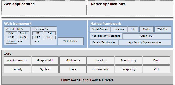 - W3C/HTML5 、デバイスAPI および WebKit2/JavaScriptCore ベースの Web ランタイムからなり、HTML5 などのウェブ標準や WAC のウェブ技術を用いてアプリケーションの開発を行う[16]。