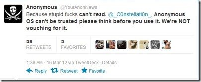 "由于信息未知,我们无法确认 Anonymous-OS 的安全性。请在决定使用她之前三思。我们不会为由此带来的信息负责。" Twitter 上 Anonymous 这样说。