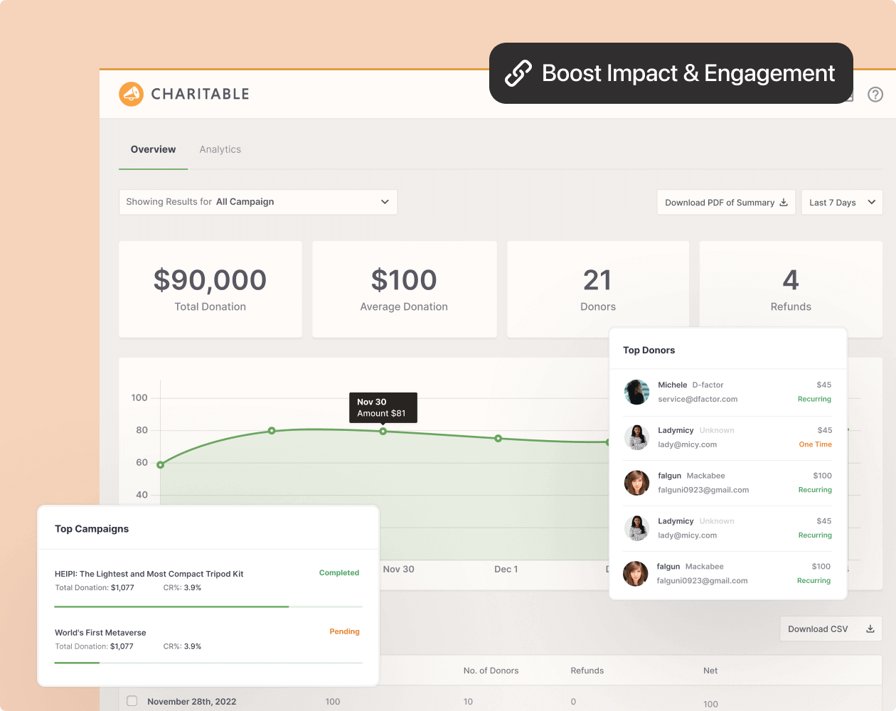 Yes, Charitable offers a complete solution to raise funds and manage donations all in one place. It includes donation forms, peer-to-peer fundraising, annual tax receipts, reports, and so much more. Try it today and see how it can simplify your fundraising efforts – we offer a money-back guarantee.