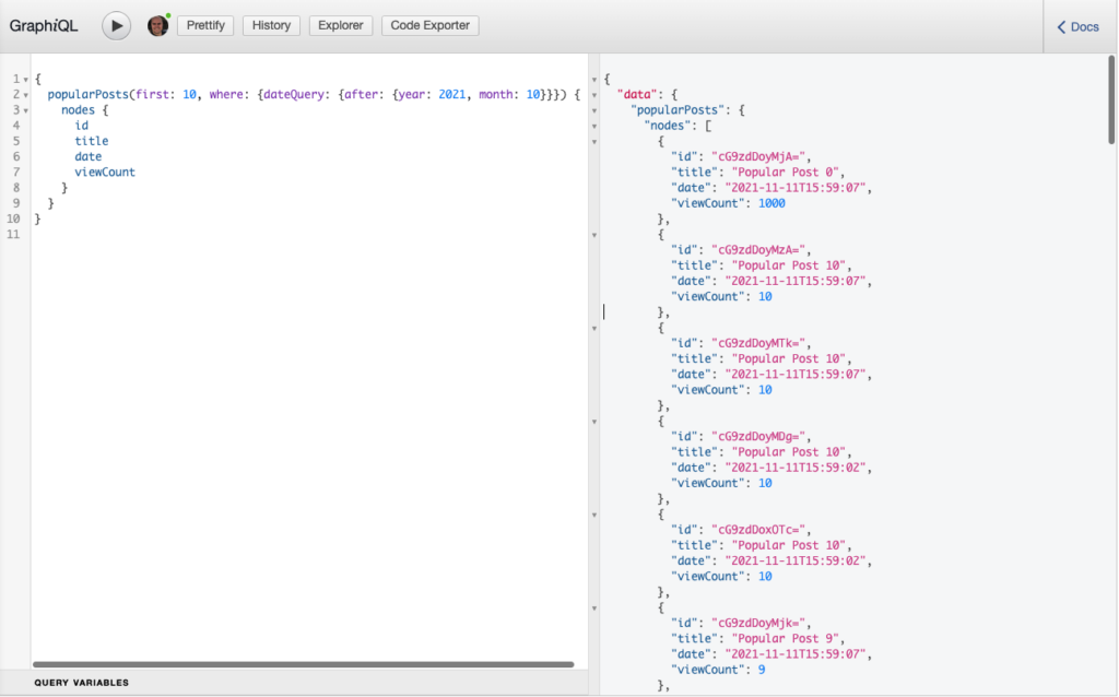 popularPosts(first: 10, where: {dateQuery: {after: {year: 2021, month: 10}}}) {