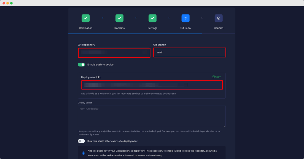 After inserting the deploy key in GitHub, click on ‘Next’ on your xCloud settings of the ‘Git Repo’ tab.