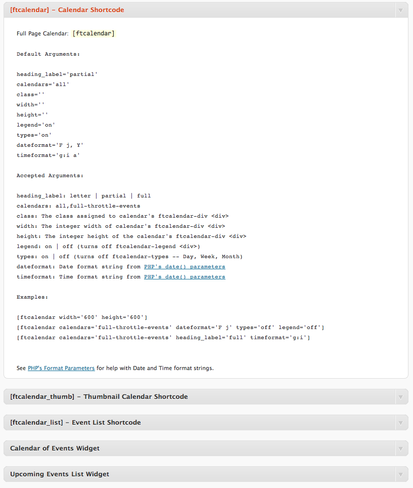 [ftcalendar]into any Post or Page you want FT Calendar to be displayed in. - Visit the FT Calendar Help page inside your WordPress dashboard to discover more shortcodes and widgets