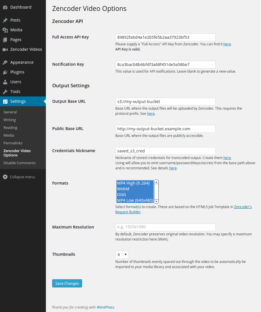 - Configure the plugin in Settings > Zencoder Video Options