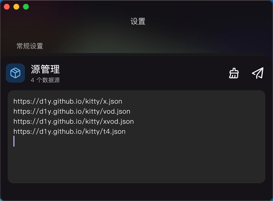 将配置文件上传到可访问的静态资源网站(如 GitHub Pages、Vercel 等),然后在小猫影视中打开「视频源管理」,添加配置文件的 URL 地址即可。