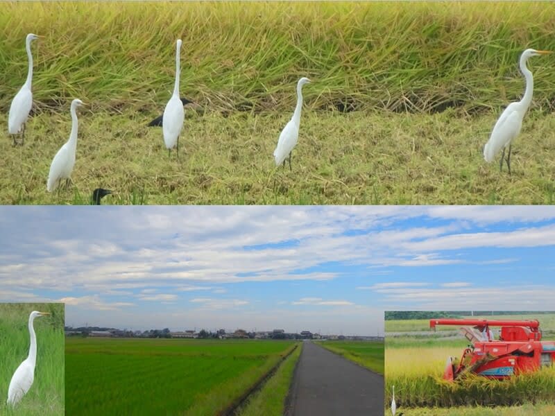 僅かに残っている稲の収穫が行なわれている、その周りには「ダイサギ」が群がっている。