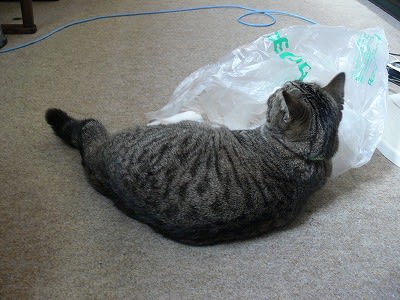 2011-10-17 買い物袋で… 猫 今日も比較的暖かな1日でしたが、晴れたり曇ったり、 夕方頃から雨になりました。 鶴岡遠征の長女のお土産(洗濯物)をまず片付けました。 袋やバッグに入れたままで、出しもしないで登校していきました。 洗濯機が稼働中の間、ママチャリで郵便局や銀行へ出かけてきました。 カリンさま、今日も体重を量ってみましたが、3.85キロで、 前回計ったときと変わらずでした。 結構食べている割には太っていないようです。 出すものもしっかり出しますからね。 ヒマそうにしているので買い物袋を与えてみました。 夢中で遊んでいます。安上がりなおもちゃです。