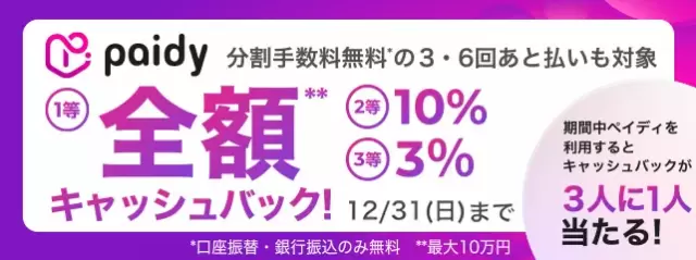 ペイディのキャンペーンでは、2023年11月20日から12月31日まで対象ショップで「あと払い(ペイディ)」を利用すると抽選でキャッシュバック。