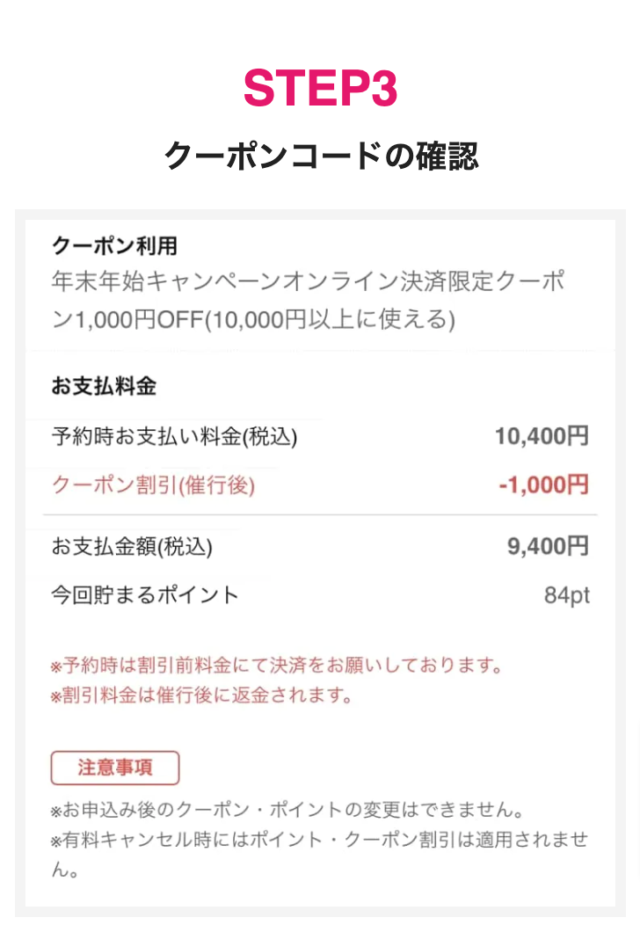 予約の確認画面でクーポンの適用がされているかをチェックしてください。