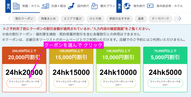 近畿日本ツーリスト【割引クーポンコード】の取得方法は、クーポンコード一覧ページから入手できます。