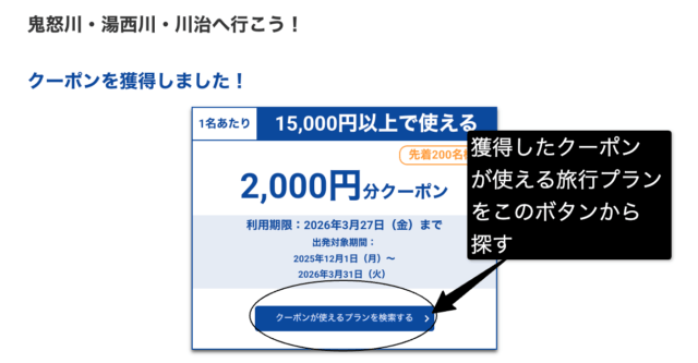 | →栃木(日光) 日光へ行こうクーポン | 2,000円/名 | 宿泊 | 画面で獲得 | 4/16まで |