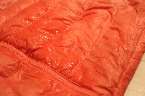 羽毛にとって水分や湿度は最大の敵。しかしながら山ではその宿敵と切っても切れない関係にあります。今回は実際に霧吹きを5プッシュし、表地の撥水性をチェックしてみました。