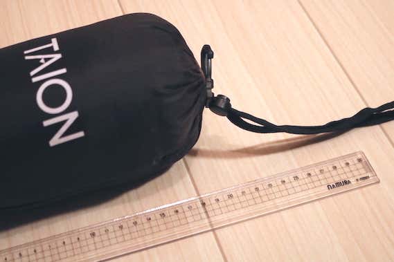 出ました、19.5cm! 3製品の中で最小をマークしました。専用の収納袋にロゴマークが入っていたり、留め金がついていたりと、ちょっとした工夫が嬉しいですね。