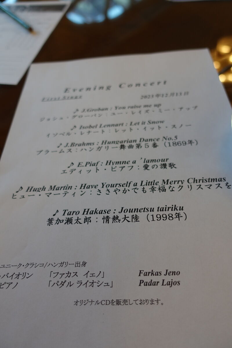 途中で1回の休憩をはさみ、1時間のコンサート時間です。一応、ホテルヨーロッパ、ホテルアムステルダム、フォレストヴィラに宿泊していれば特典として無料で利用できるようですが、テーブルの上に何もないとちょっと恥ずかしいです。結局、ホテルヨーロッパに宿泊していてもワンドリンクを注文してしまいます。