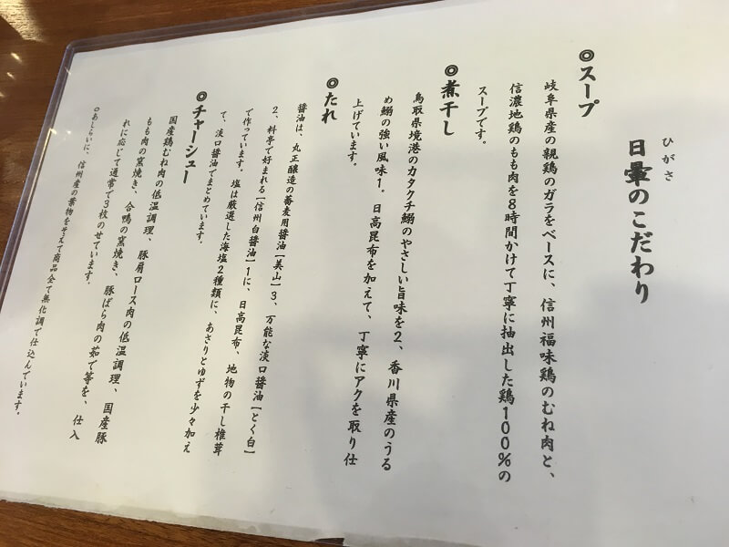 松本市「中華蕎麦 日暈」のメニューは比較的シンプルなもの。