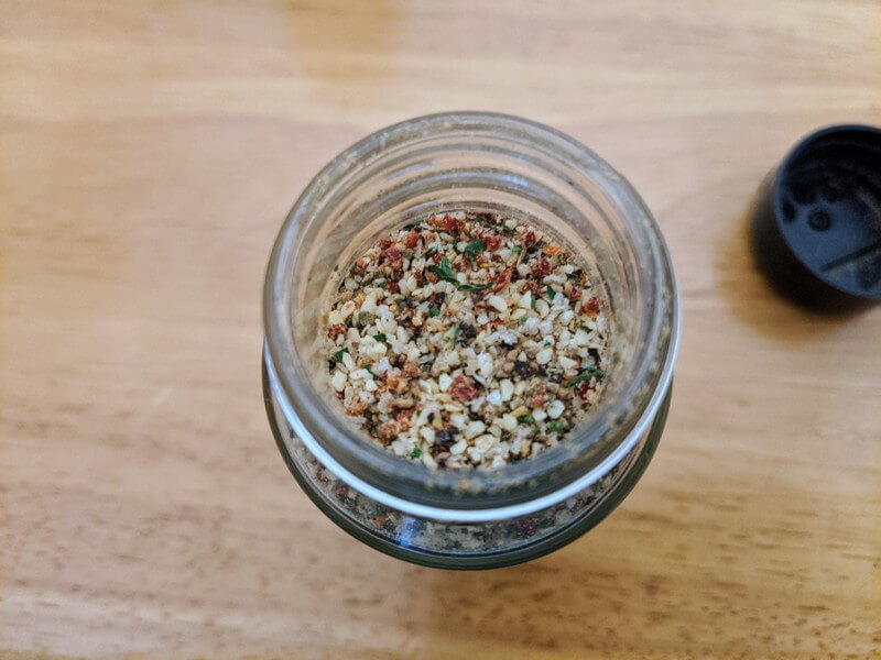 原材料名:食塩(国内製造)、フライドガーリック、黒コショウ、赤唐辛子、オニオン、粉末醤油(小麦・大豆を含む)、コーンパウダー、鰹節粉末、ガーリック、昆布粉末、植物油脂、パプリカ、コリアンダー、オレガノ、バジル、ナツメグ、マジョラム、パセリ、調味料(アミノ酸等)、微粒二酸化ケイ素
