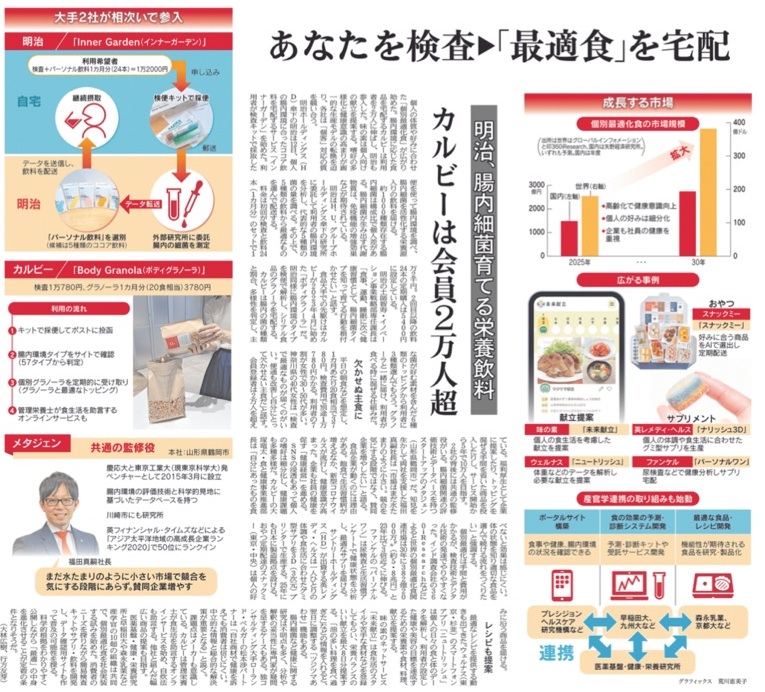 個人の体質や好みに合わせた「個別最適化食」が広がり始めた。腸内環境に応じた食品を宅配するカルビーは利用者を2万人に伸ばし、明治も参入した。味の素は個人向けの献立を提案する。嗜好の多様化と健康意識の高まりが画一的な生産モデルの転換を迫り、各社は「個客」対応の質を競い合う