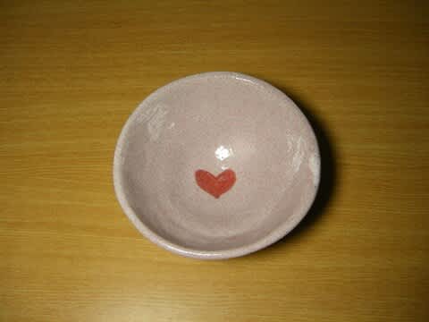 ワンポイントのハートも可愛く。乳白釉に桃色マット釉。
