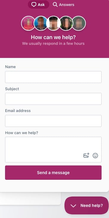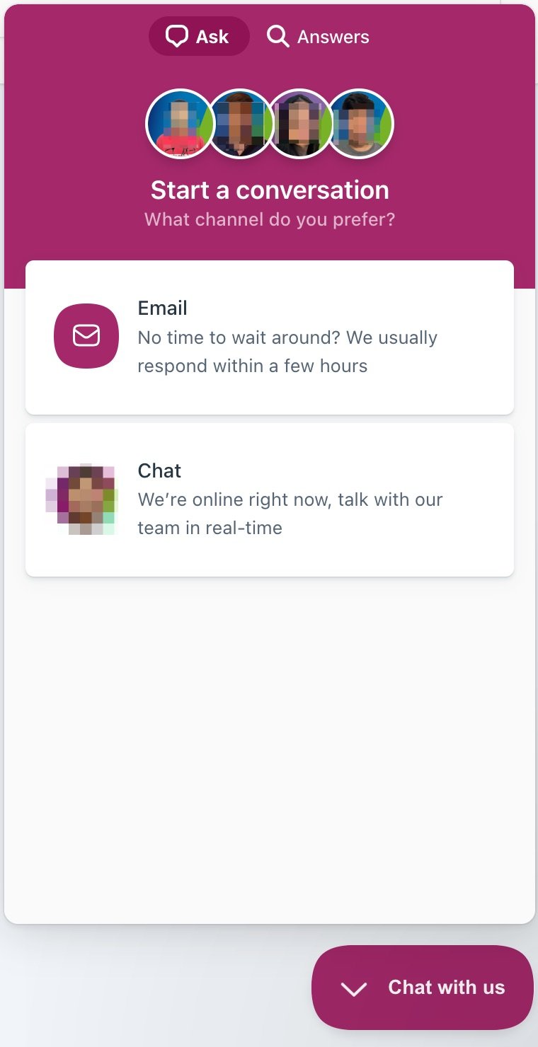 Click the Chat with us button to open the help beacon. Under Answers, you’ll find the most popular help articles; you can also search for any specific problem you have. Under Ask, you can contact the support team via e-mail or enter the live chat to talk to our support team directly.