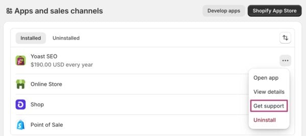 In your Apps and sales channels settings, you see an overview of your apps, including the Yoast SEO app. When you click on the three-dot menu, you can go to Get support.