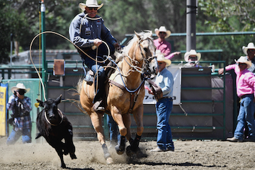 タイ・ダウン・ローピングの場合は、ロープが牡牛を捕らえた後、カウボーイは下馬し、牡牛の脚を捕縛しなければならない。ドイルは既に下馬の態勢に入っているのが見える。この後、無事に下馬し、作業を完了。残念ながら、記録は15.0秒だった。
