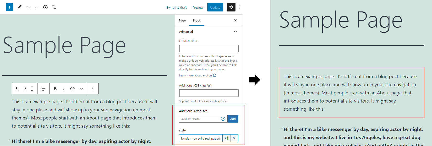 This plugin adds additional advanced inspector controls to Gutenberg blocks that allow to add any custom HTML attributes to the block’s front-end output. This allows you to add inline styles to fine-tune the block’s appearance, set aria attributes to improve your site’s accessibility, add data attributes to integrate with any JavaScript modules or even JavaScript DOM event attributes such as onclick, onchange or onload.