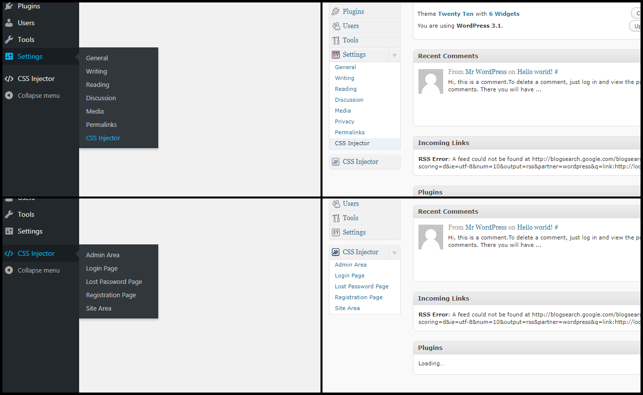 Easy navigation in old and new WordPress versions (4.8.1 on left, 3.1 on right).