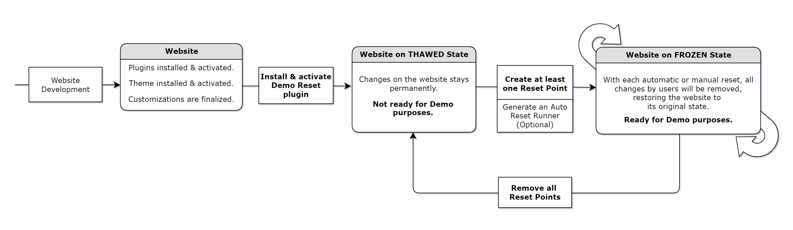 Simply install the Demo Reset free plugin or Demo Reset Pro plugin on your WordPress website and create a Reset Point to put the site in the Frozen State (Demo Mode). This allows you to let your customers to interact with the website without any risk of permanent changes. With each automatic or manual reset, all customer changes will be removed, restoring the website to its original state. In short; Now your website is ready for Demo purposes.