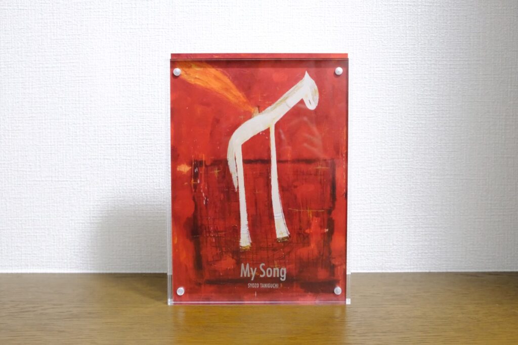 先ほどの磁石式アクリルフォトフレームでははみ出していた、谷口正造さんの個展DMです。枠が大きくなった分余白が増え、綺麗に飾れている印象があります。