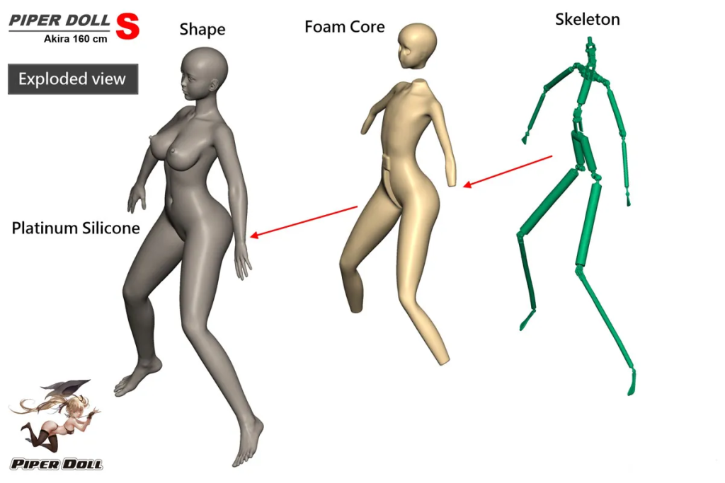 膣、太もも、お尻、腹などの部位を局部的に柔らかく仕上げるのは、実際ハードフィートとハードハンズとはちょうど反対する技術で、その部位たちのみを柔らかいシリコンで生産する技術です。両方とも柔らかい素材であるため、両素材間の線はないです。