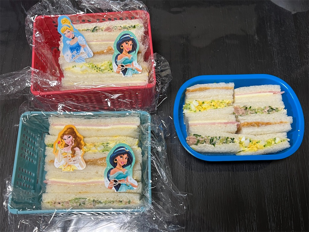 何の変哲もない普通のサンドイッチに、プリンセスのパックをつけただけのお弁当です(笑)