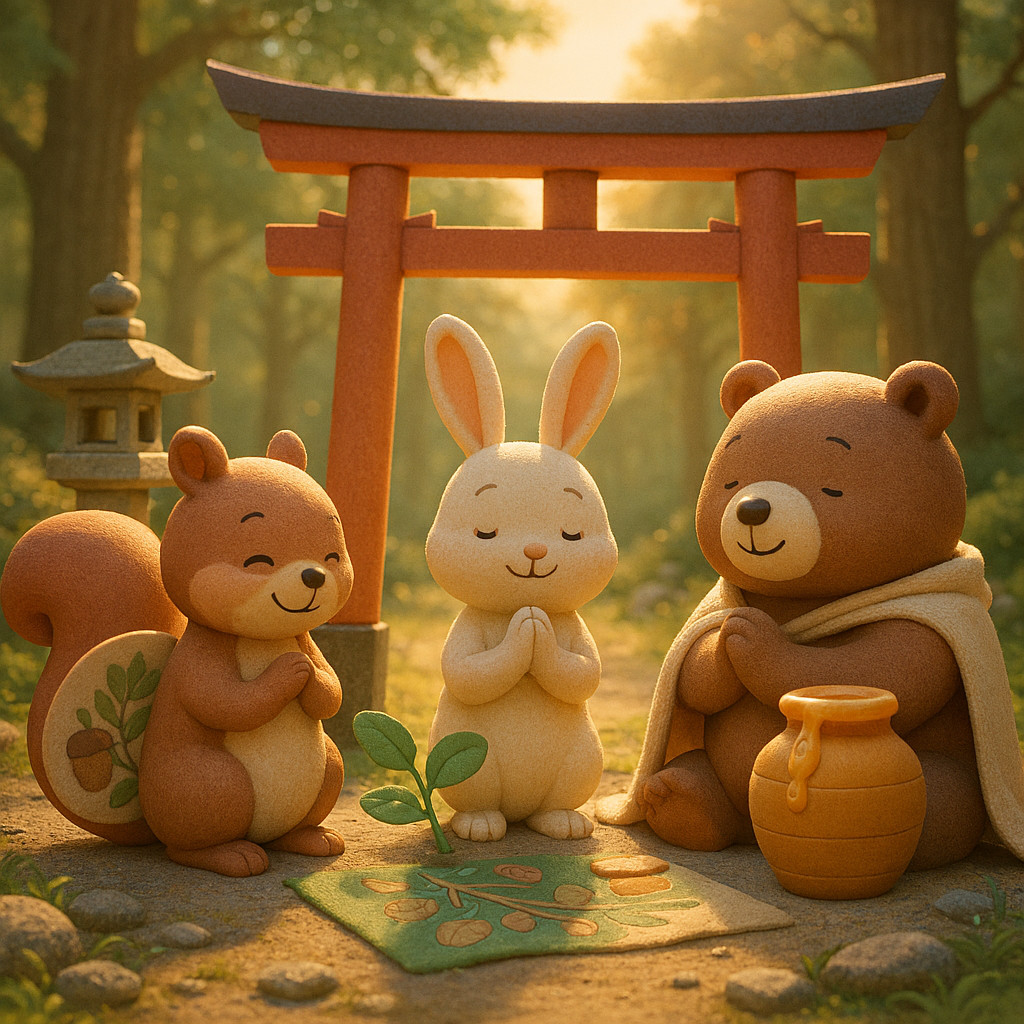 リスのリッキー、ウサギのウーちゃん、クマのクーちゃんは、写真に書をのせます。